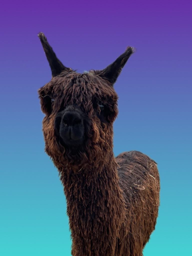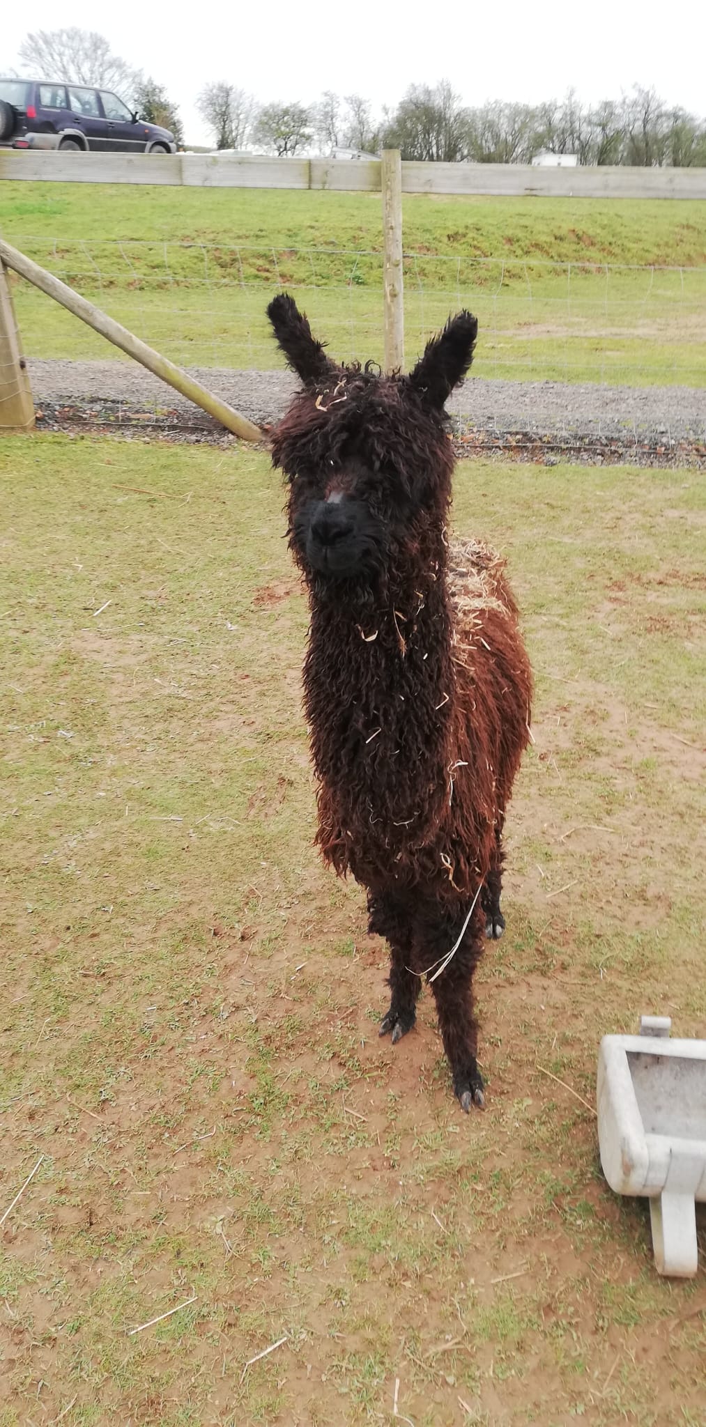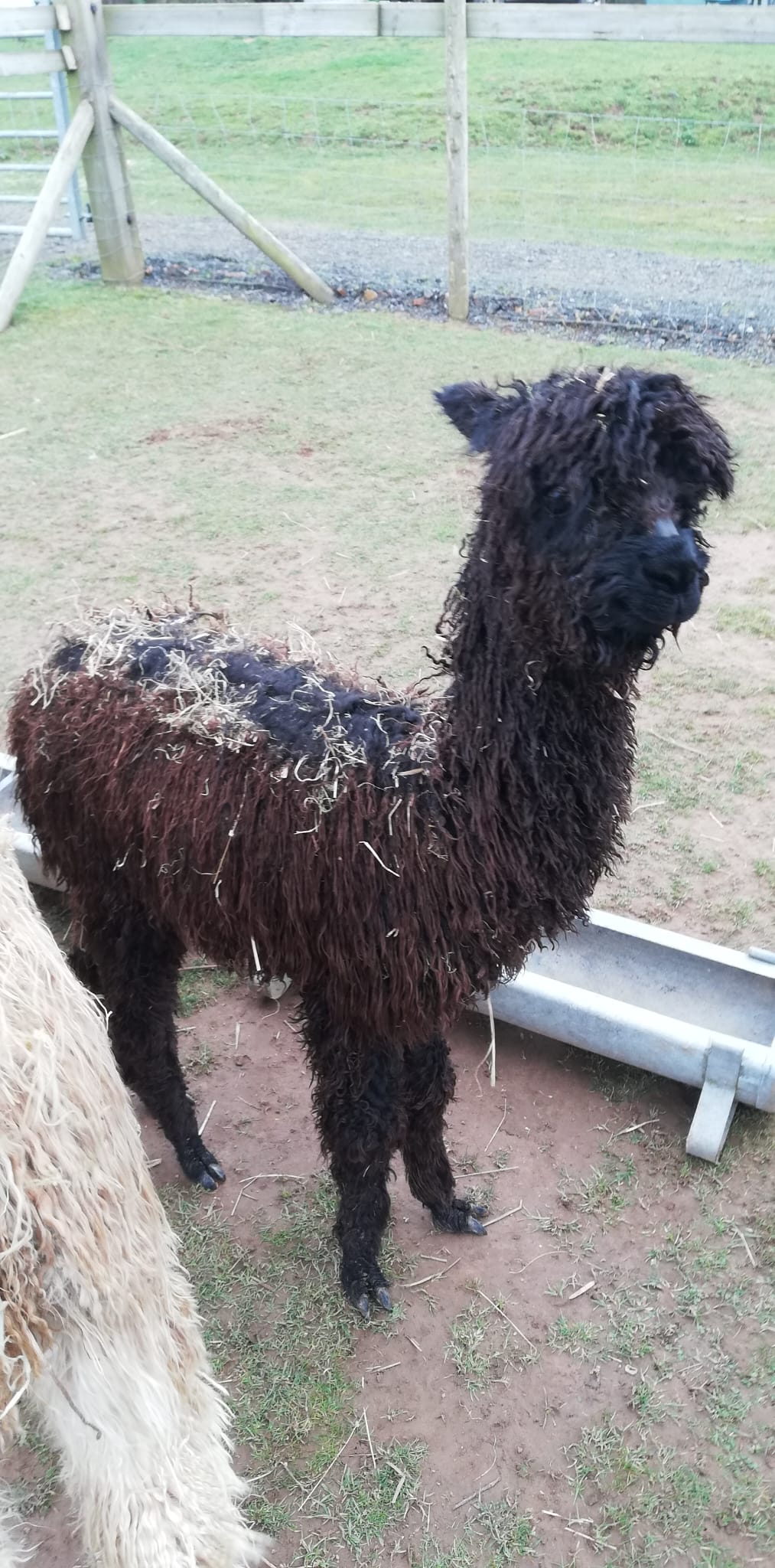 I am a male alpaca, I was born 28th August 2023 and I am a Suri alpaca and my colour is Black with Brown highlights how cool is that! . My dad is Popham Suri Sunray a Suri alpaca and my mum is Faraway Mazikeen a solid beige Suri Alpaca and I moved to Severn Valley Alpacas with my brothers Rhyder and Simba.